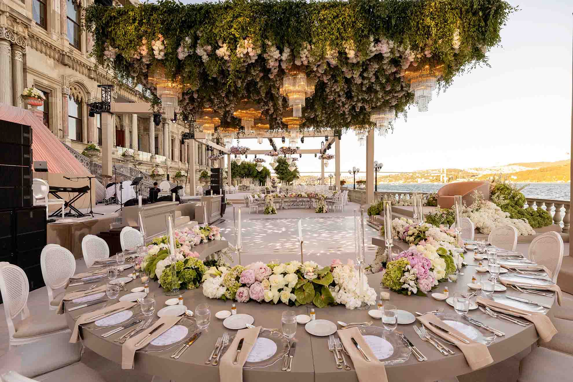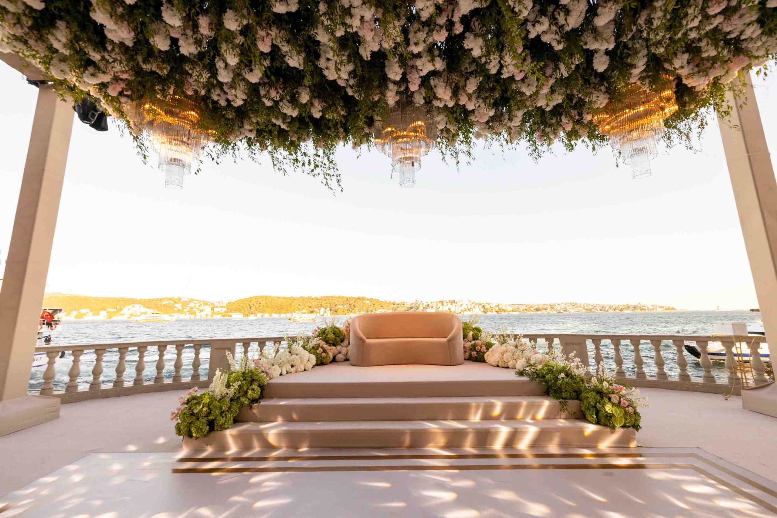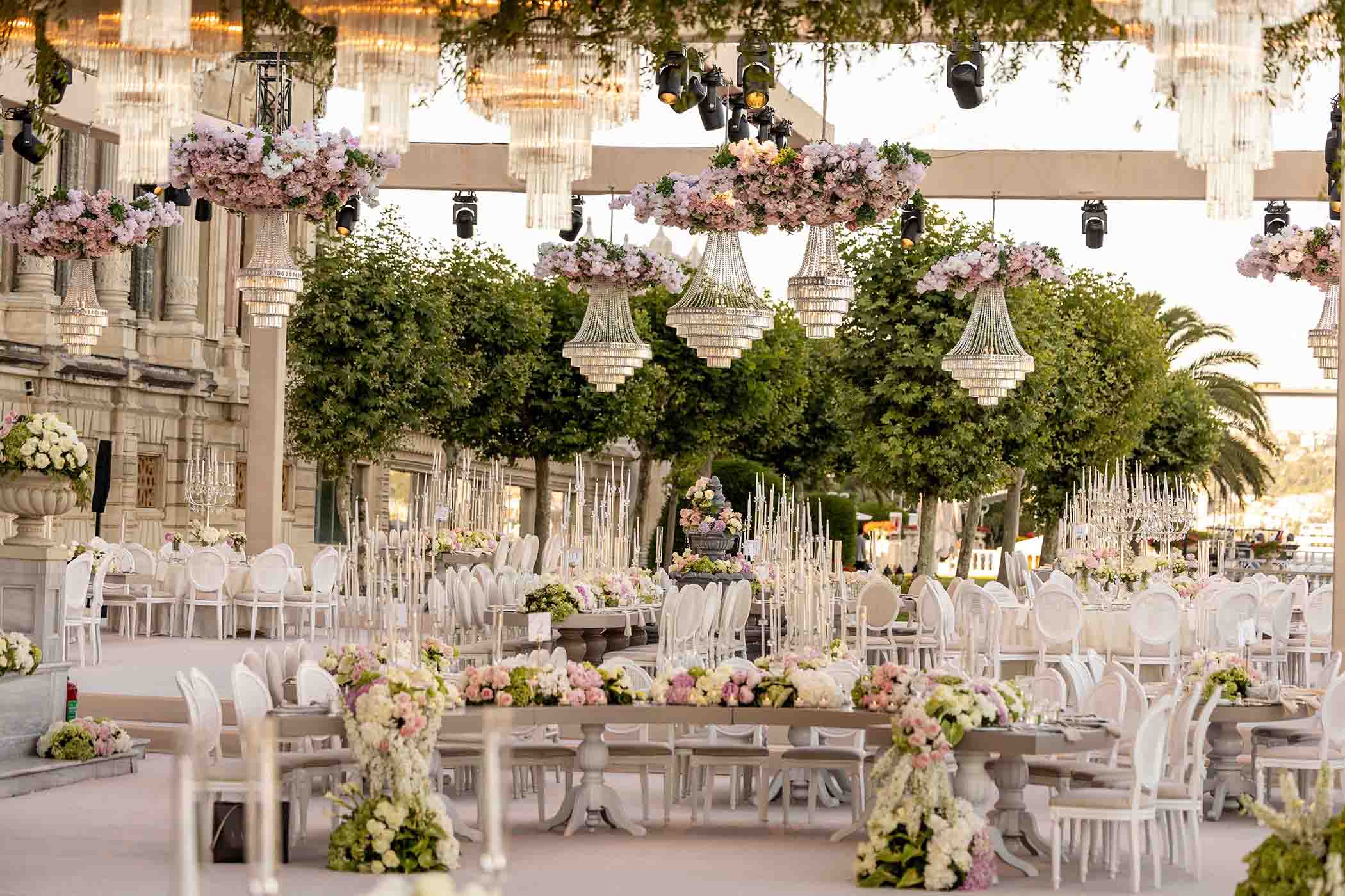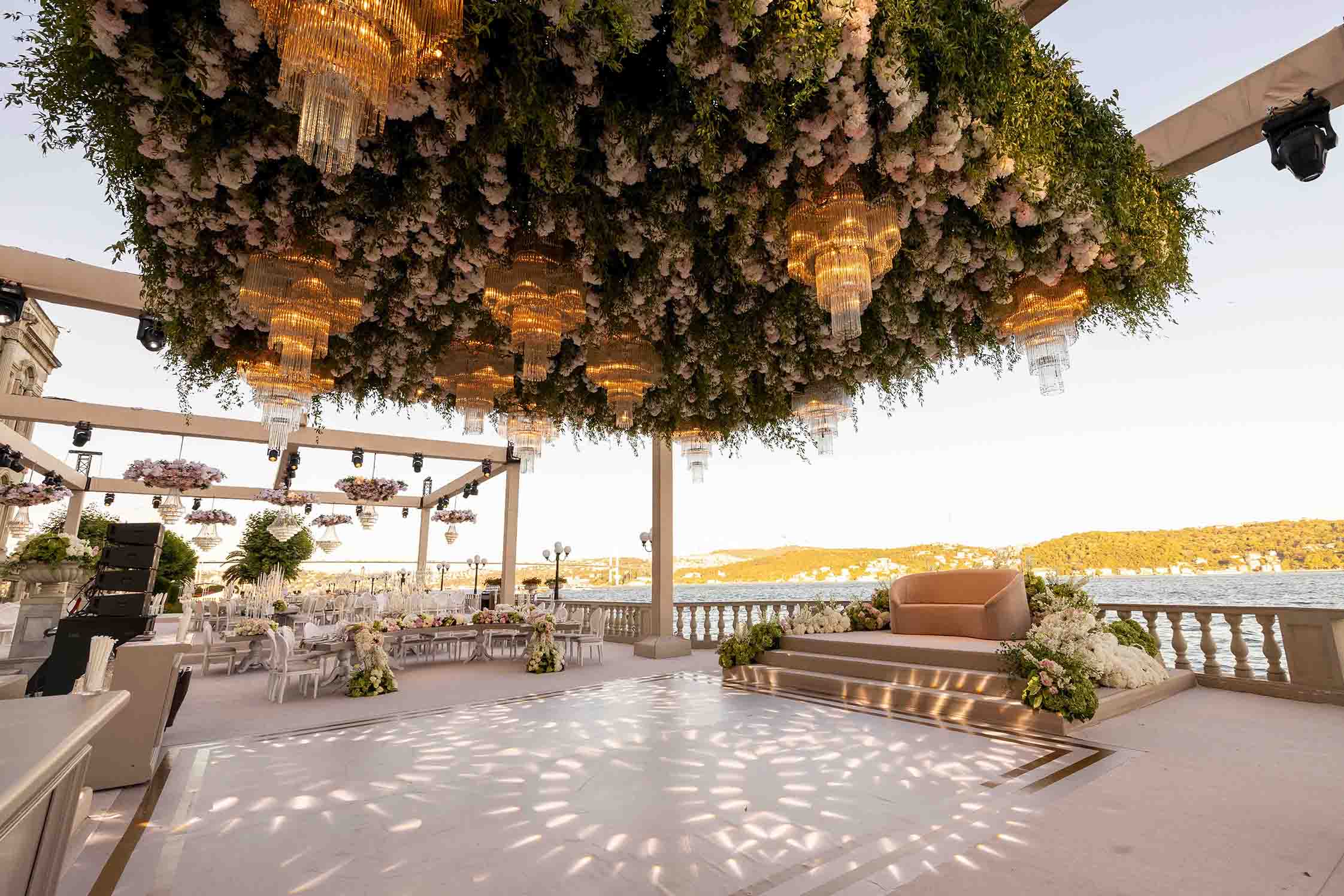 Amerika’dan gelen özel çiftimiz için Çırağan’da bir çiçek bahçesi yarattık. Açık tonların ve yeşilliklerin ön planda olduğu bu büyüleyici düğünde saray, sanki bu renklerle yeniden hayat buldu. Çırağan’ın ihtişamının bir parçası olan kristal detaylar ve göz alıcı avizeler de dekorun içine dahil edildi.